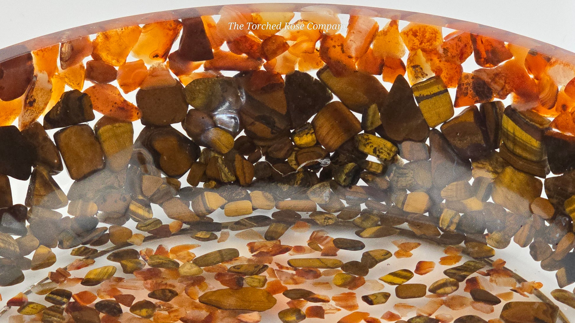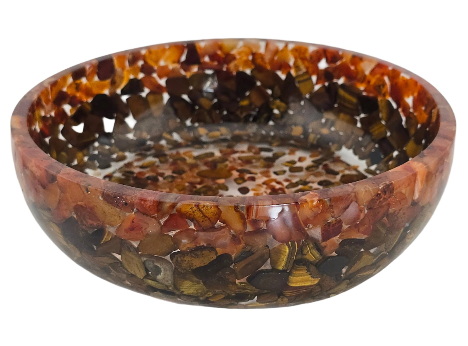 Bring the powerful combination of Carnelian and Tiger's Eye to your space with our 8" Decorative Pairing Bowl! Together they are said to amplify your creativity, resilience, and power to manifest your dreams. Stage it as a Zen Garden, store snacks, as a catch-all bowl, or as a standalone decor item. The fiery glow of the Carnelian and chatoyancy of the Tiger's Eye will draw attention, while the durable clear epoxy construction will keep it beautiful for years to come.