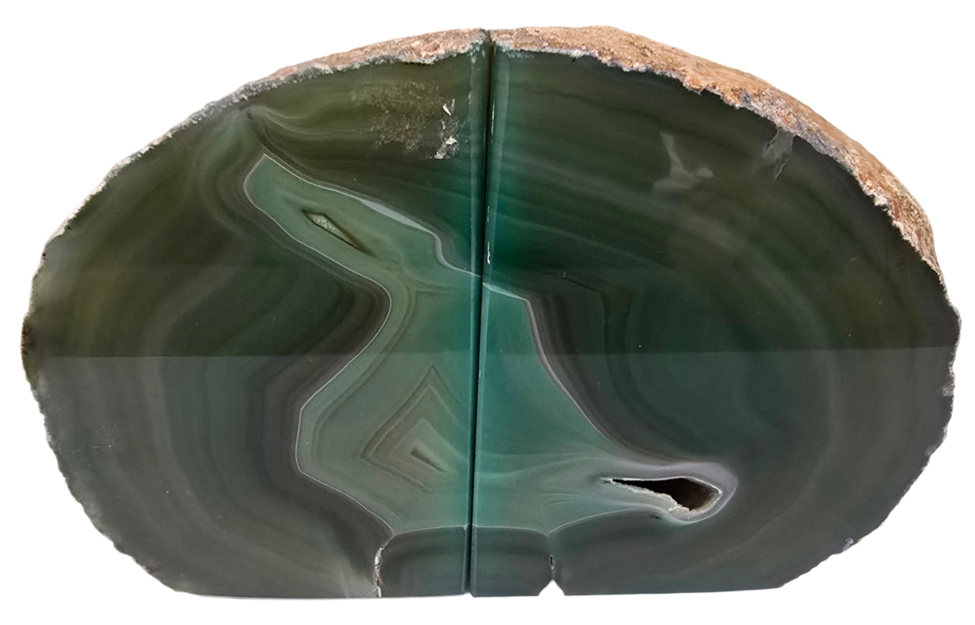 Elevate your home decor with our Agate Bookends. These luxurious bookends, dyed in rich green hues, not only keep your books secure on your shelf, but also add a touch of sophistication to your space. Let these stunning pieces be the talk of your next gathering.