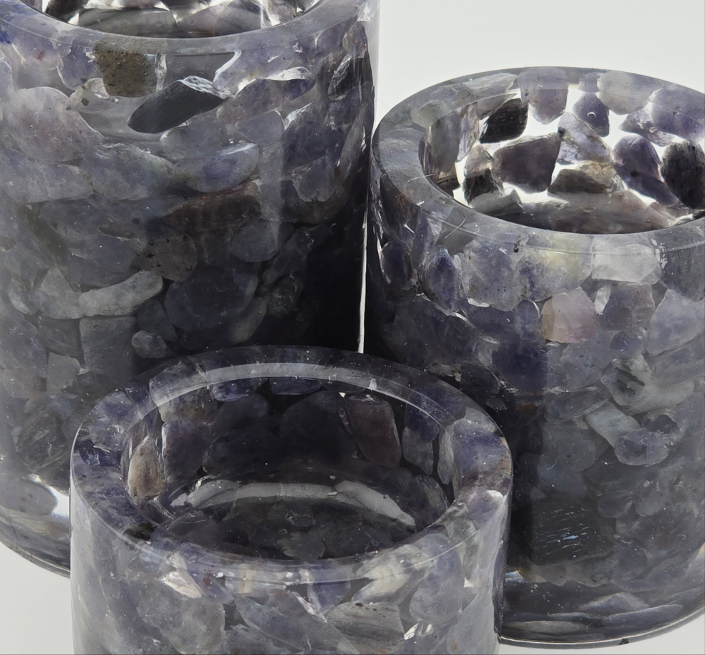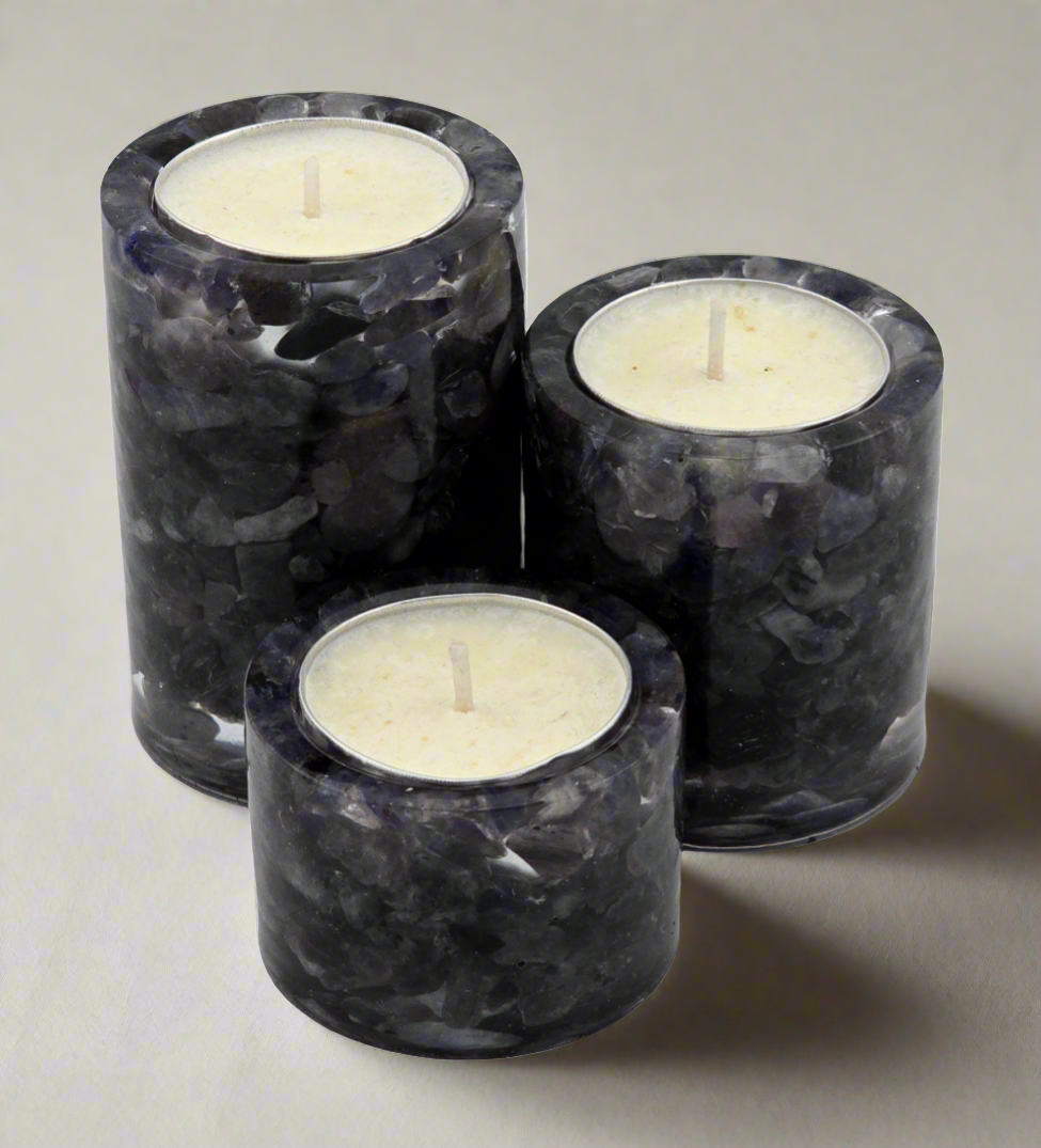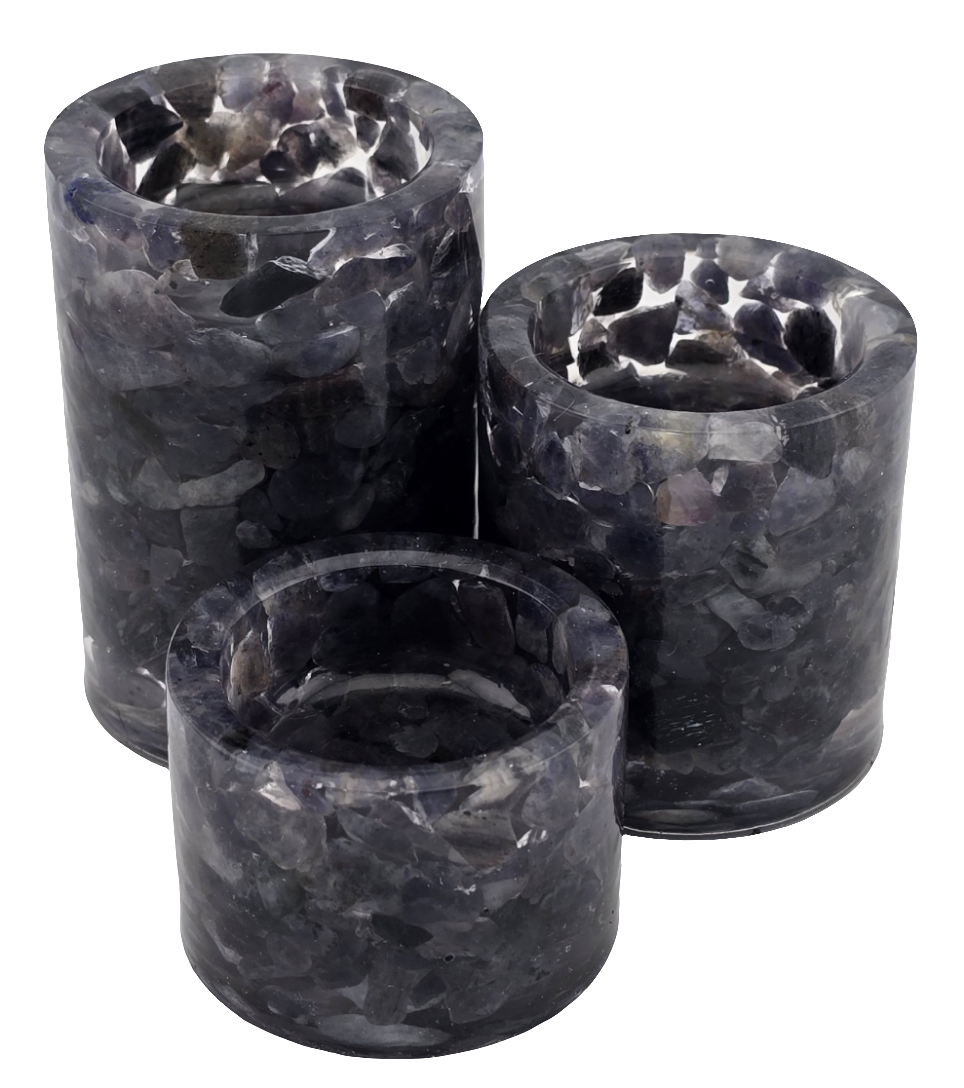 Elevate your space with the Cylinder Tea Light Holder Set featuring genuine Iolite chips encased in durable epoxy resin for lasting beauty and protection. Epoxy Resin is more impact resistant than plastic, and more shatter resistant than glass. This 3-piece set not only adds a warm, inviting glow but also brings the calming energy of Iolite, believed to strengthen the connection between mind and heart. Let Iolite enhance your imagination and gain clarity on personal growth as you enjoy the soothing ambiance created by these elegant holders. Perfect for creating a peaceful, inspiring atmosphere in any room.