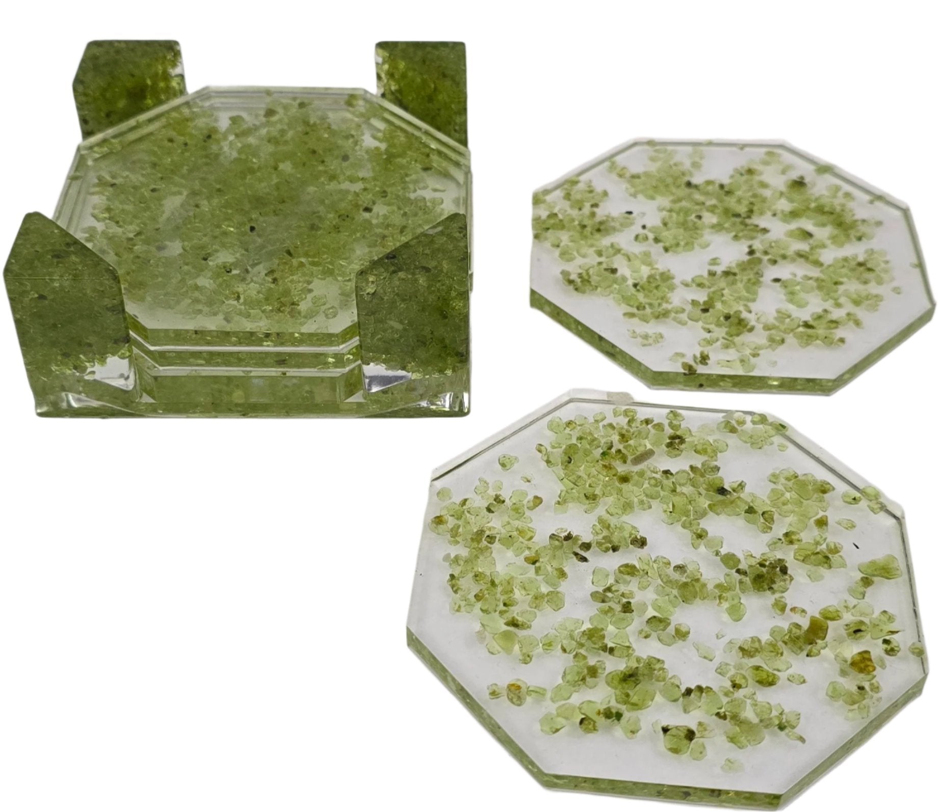 Experience the healing and renewing power of Peridot with our Octagon Coaster Set. Made with genuine Peridot, each set includes a holder and five coasters. Promote compassion and balance in your home with this functional and beautiful addition. Perfect for those looking to bring positive energy into their space.