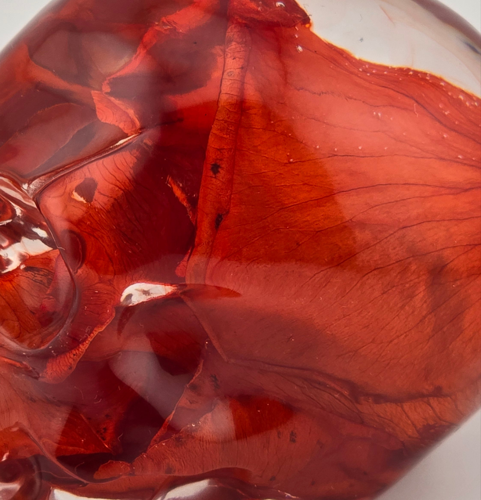 Experience mesmerizing beauty all year long with the Red Rose Petal Skull. Real red rose petals are preserved and bonded with durable epoxy for long-lasting allure. As light passes through, the display is truly captivating. Perfect for any display, this skull is a must-have for any enthusiast.