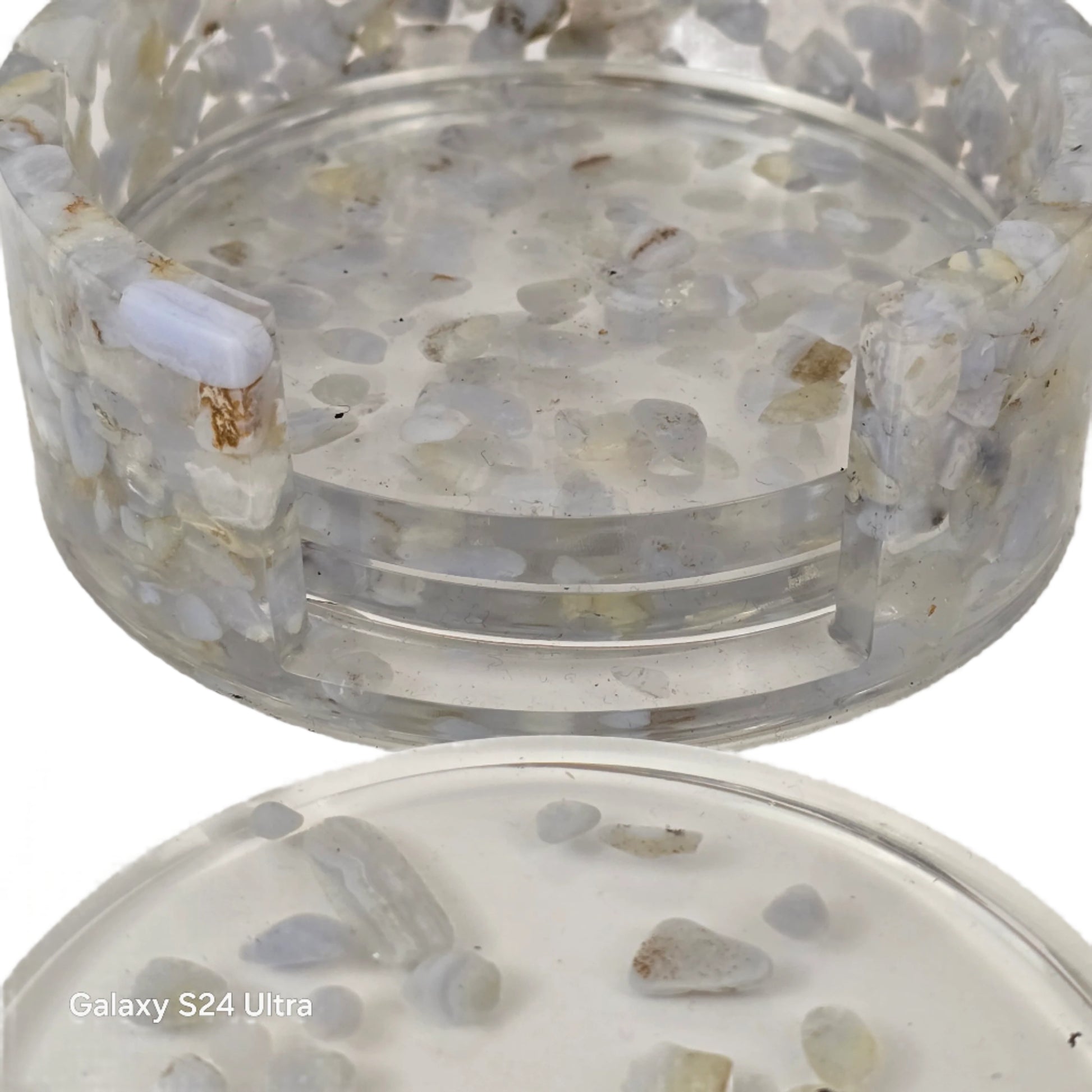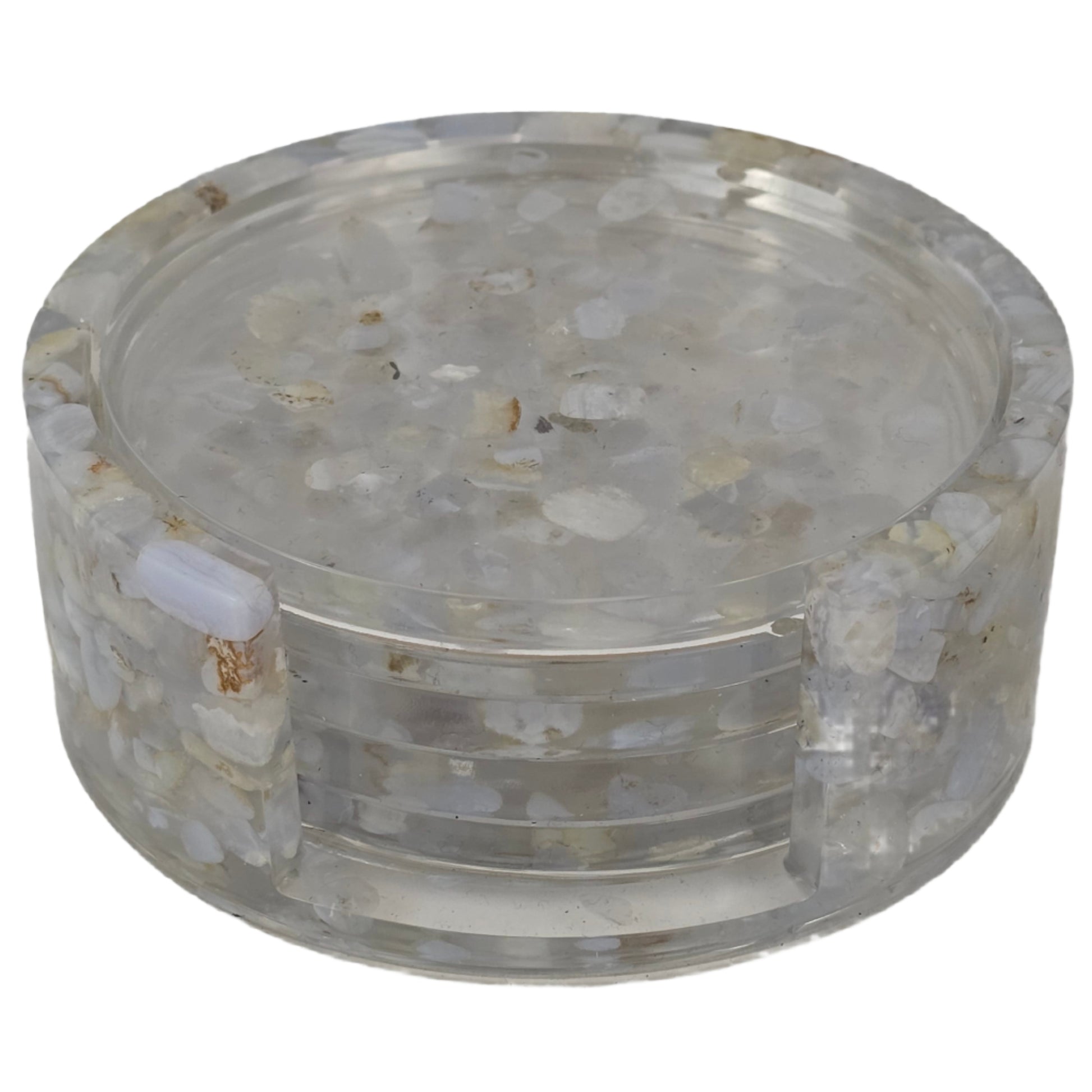 It is said that Blue Lace Agate brings peace, tranquility, and encourages free expression of thoughts and feelings. It protects against negative energy and encourages spiritual growth. We believe that incorporating this stone into a coaster set is an amazing way to bring the stone's amazing energy into your home, in a functional way. Each set includes a holder and 5 coasters.