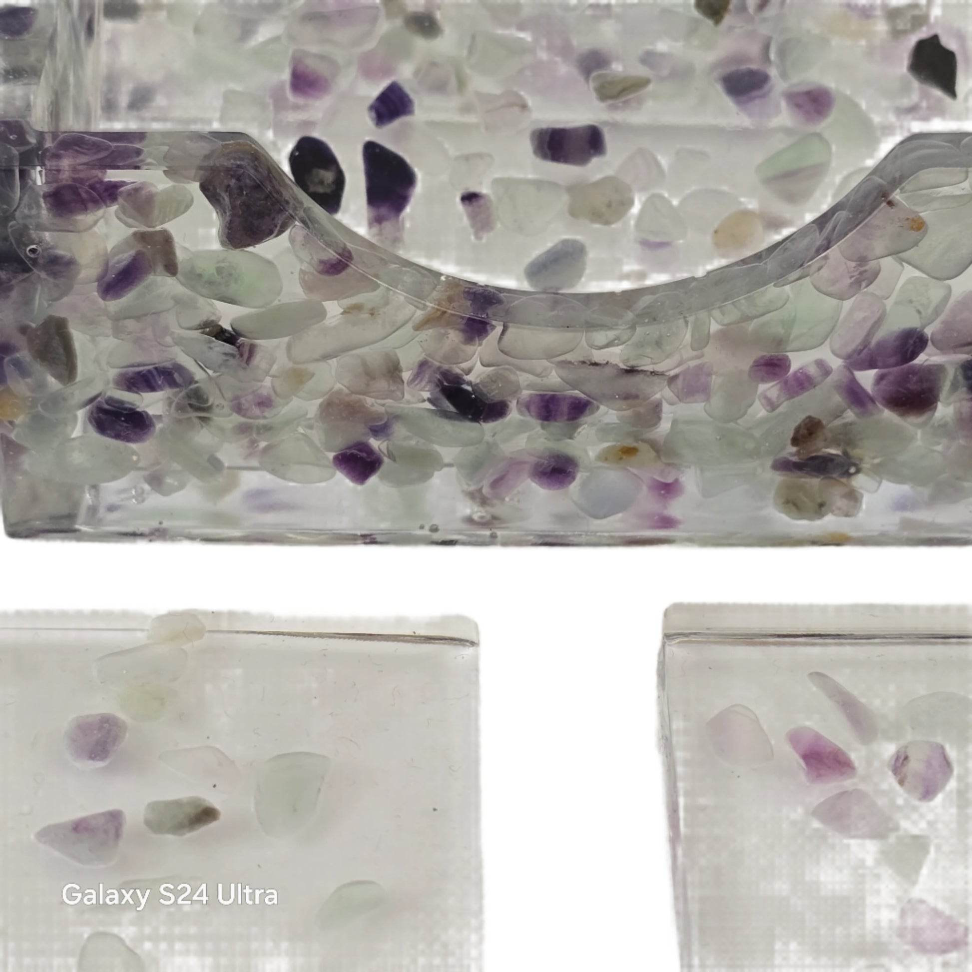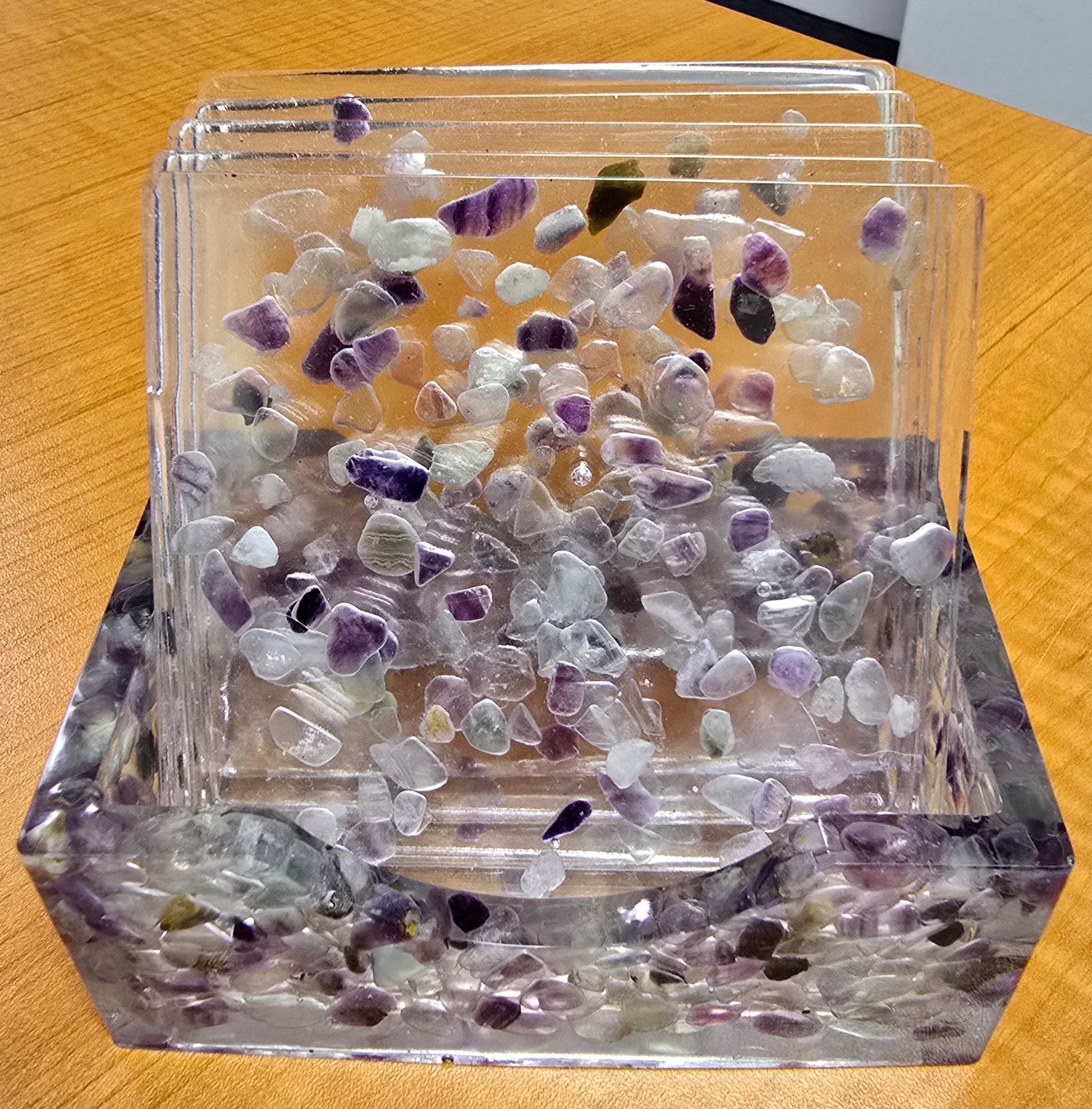 Rainbow Fluorite symbolizes balance, harmony, intuition, and protection. With this coaster set, The Torched Rose Company has found a way to incorporate chips of this amazing semi-precious gemstone into your home in a functional way, using durable epoxy resin for protection of the stone. The natural, unique nature of this stone ensures your set is truly one of a kind. Each set includes a holder and 5 coasters.