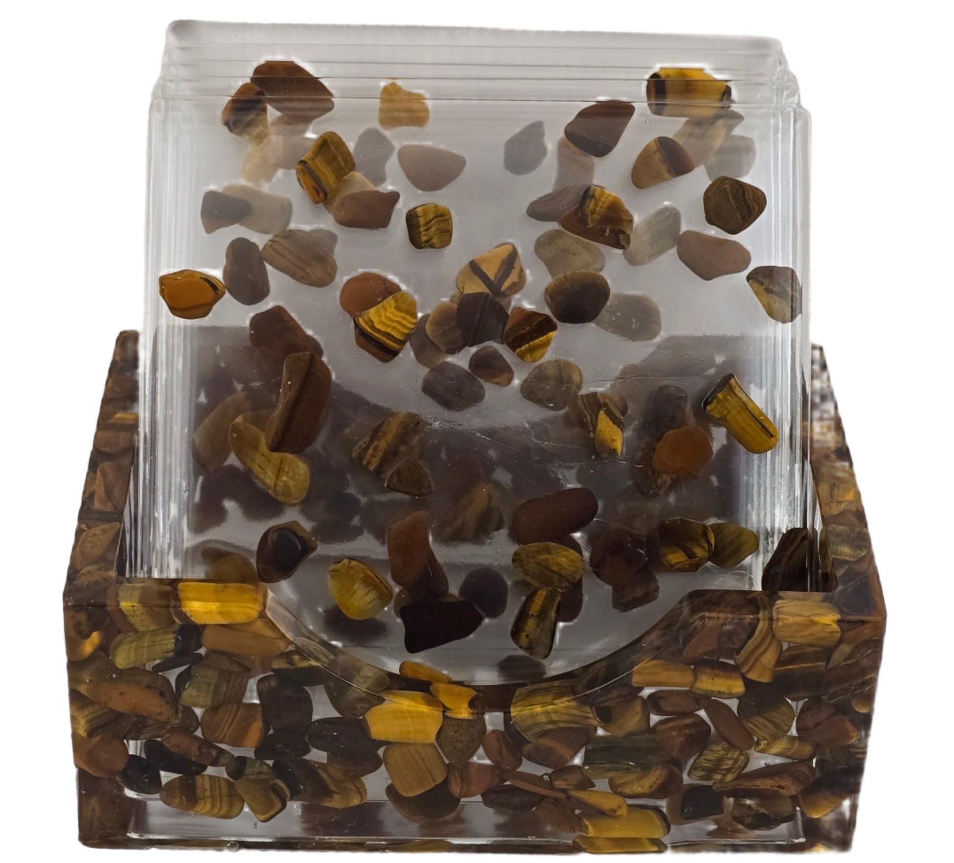 Tiger's Eye is said to increase your self-confidence and act as a protective shield from negative energy. These beautiful semi-precious stones have been encased in crystal clear, durable epoxy to protect the stones in even the busiest of surroundings. The gold and brown hues will shift with the light throughout the day in this stunning coaster set, making a sure conversation starter. Each set contains 1 holder and 5 coasters.