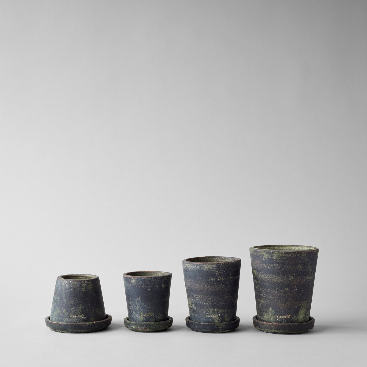 These hand-thrown terra cotta trays are wiped with a soft green wash to mimic the look of a mossy, weathered patina. Pair with hand-thrown Basic Patina pots. The patina of each tray varies slightly.