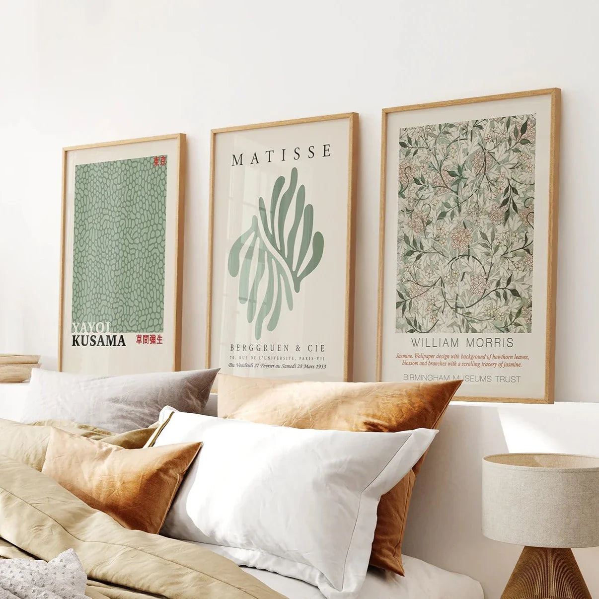 Add a touch of contemporary elegance to your home decor with our Yayoi Kusama Sage Green Print Set of 3. This framed museum poster set is perfect for any art lover, featuring exhibition-style pieces by Yayoi Kusama, Matisse, and William Morris. Perfect for your gallery wall, these canvas prints will bring a unique and modern touch to your living room.